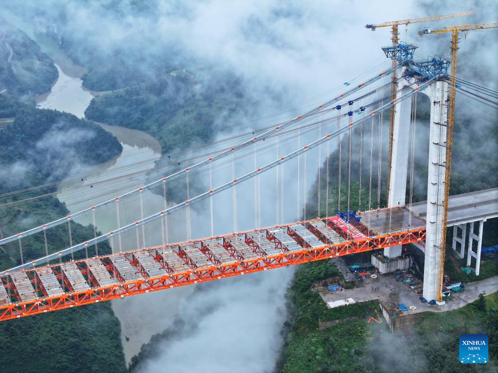 An aerial drone photo taken on Sept. 23, 2025 shows the Tianmen grand bridge under construction in southwest China's Guizhou Province. The Tianmen grand bridge on the Anshun-Panzhou highway, with a length of 1,553 meters and the bridge floor hung about 560 meters above the canyon water, finished its closure on Tuesday. (Xinhua/Liu Xu)