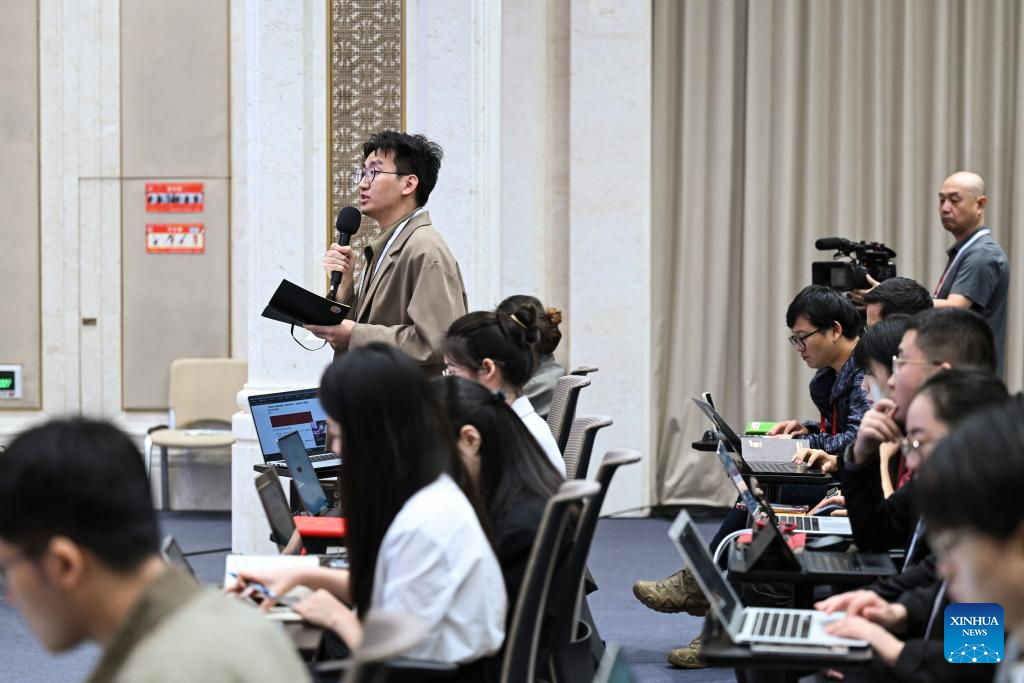 A journalist asks questions at a press conference held by the State Council Information Office (SCIO) on China's achievements in emergency management reform and development during the 14th Five-Year Plan period (2021-2025) in Beijing, capital of China, Sept. 24, 2025. Wang Xiangxi, minister of emergency management, Zhou Tian, vice minister of emergency management and chief of the national fire and rescue administration, Huang Jinsheng, head of the national mine safety administration, and Wang Kun, head of the China Earthquake Administration, attended the press conference on Thursday. (Xinhua/Chen Yehua)