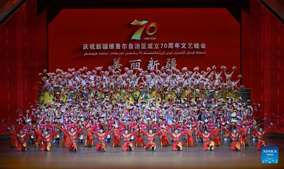 A gala entitled "Beautiful Xinjiang" is held to mark the 70th founding anniversary of Xinjiang Uygur Autonomous Region in Urumqi, the regional capital, Sept. 24, 2025. (Xinhua/Shen Hong)