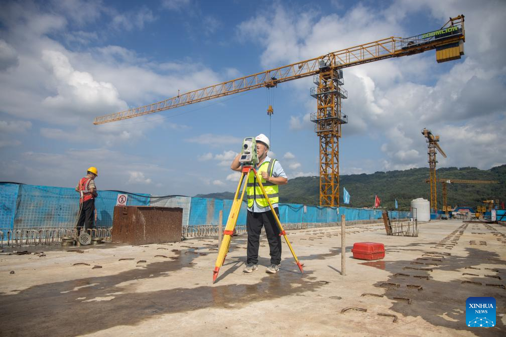 A worker works at the construction site of a double-track grand bridge along the Chongqing-Wanzhou high-speed railway over the Wubu River in southwest China's Chongqing Municipality, Sept. 24, 2025. Contracted by China Railway 12th Bureau Group Co., Ltd., the main span of the grand bridge finished its closure on Wednesday, laying a foundation for the opening of the whole line on schedule. (Xinhua/Tang Yi)