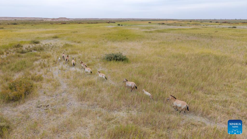 Przewalski's horses are pictured in the Dunhuang West Lake National Nature Reserve in Dunhuang, northwest China's Gansu Province, on Sept. 24, 2025. The Dunhuang West Lake National Nature Reserve in Gansu Province covers an area of approximately 660,000 hectares, featuring a diverse ecosystem including wetlands, grasslands, forests and Gobi deserts, which makes it an experimental zone for the wild release of the Przewalski's horses. (Xinhua/Lang Bingbing)