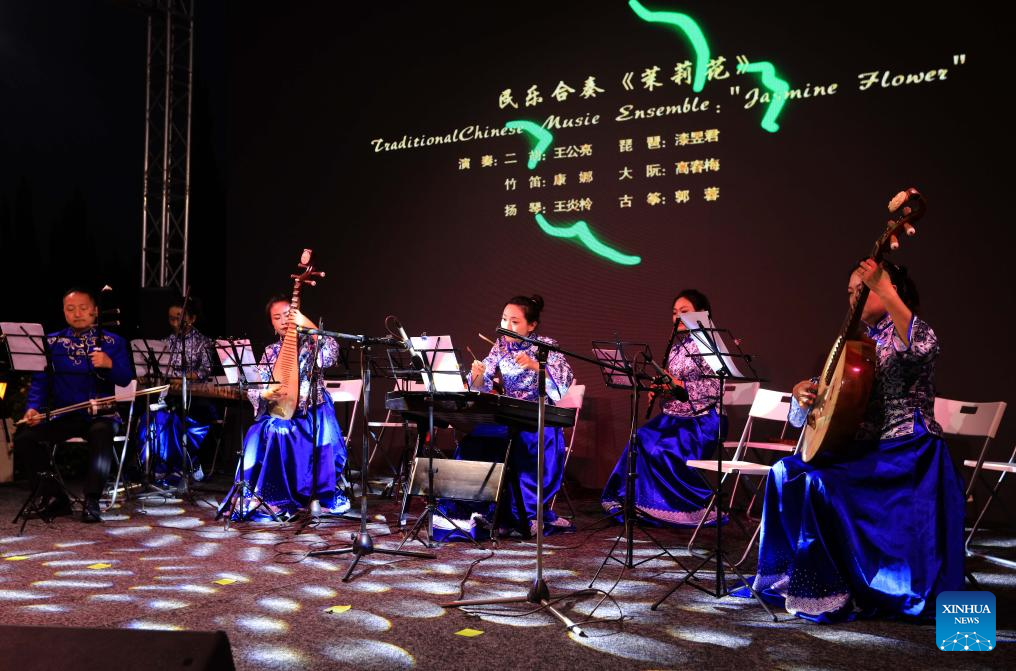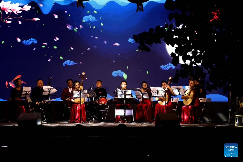 Artists perform during the 2025 "A Moment to Remember -- Mid-Autumn Chinese Folk Concert" in Amman, Jordan, on Sept. 24, 2025. The concert was staged here on Wednesday evening, offering Jordanian audiences a vibrant showcase of Chinese folk music. More than 300 delegates from both countries attended the concert. (Photo by Mohammad Abu Ghosh/Xinhua)