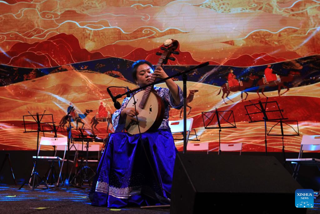 An artist performs during the 2025 "A Moment to Remember -- Mid-Autumn Chinese Folk Concert" staged in Amman, Jordan, on Sept. 24, 2025. The concert was staged here on Wednesday evening, offering Jordanian audiences a vibrant showcase of Chinese folk music. More than 300 delegates from both countries attended the concert. (Photo by Mohammad Abu Ghosh/Xinhua)
