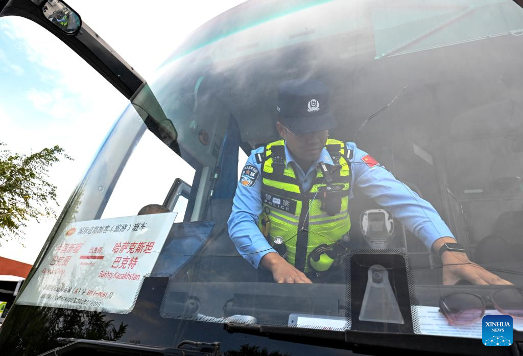 An immigration officer inspects an outbound bus for Kazakhstan at Bakti port in Tacheng, northwest China's Xinjiang Uygur Autonomous Region, Sept. 17, 2025. Xinjiang is seeing increased vitality across the board as the region accelerates its efforts to the construction of the New International Land-Sea Trade Corridor, a key logistics network connecting China's western regions to global markets. (Xinhua/Wang Fei)