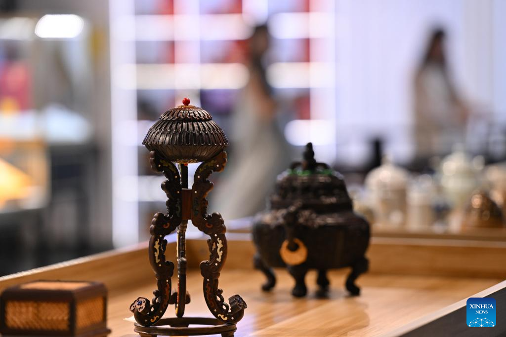 This photo taken on Sept. 24, 2025 shows an incense burner handicraft made of rosewood at an agarwood museum in Xianyou County, southeast China's Fujian Province. Xianyou County is a significant trading and distribution center for agarwood and sandalwood in China. In recent years, the county has been working on the development of its incense-related business by leveraging the abundance in raw materials, a mature incense-making industrial chain, and online and offline sales networks there. (Xinhua/Jiang Kehong)