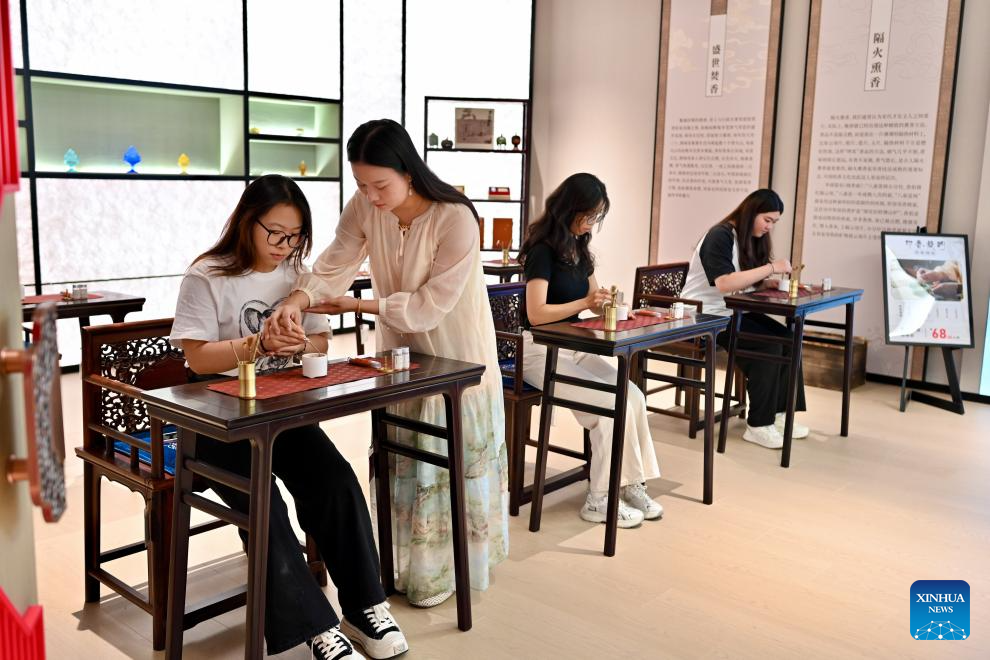 Women try incense-making under the guidance of a staff member at an agarwood museum in Xianyou County, southeast China's Fujian Province, on Sept. 24, 2025. Xianyou County is a significant trading and distribution center for agarwood and sandalwood in China. In recent years, the county has been working on the development of its incense-related business by leveraging the abundance in raw materials, a mature incense-making industrial chain, and online and offline sales networks there. (Xinhua/Jiang Kehong)