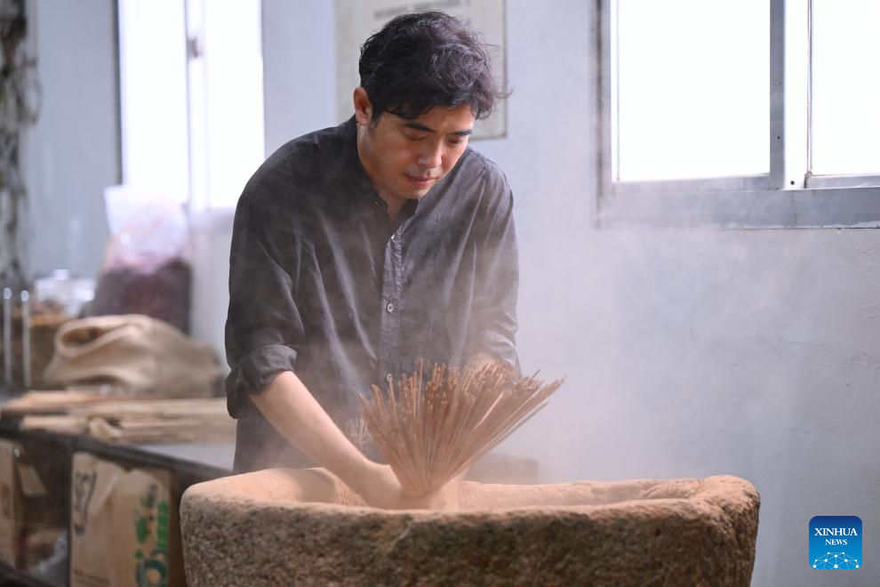 Chen Bin, an incense-making artisan, makes natural incense by hand in Xianyou County, southeast China's Fujian Province, on Sept. 24, 2025. Xianyou County is a significant trading and distribution center for agarwood and sandalwood in China. In recent years, the county has been working on the development of its incense-related business by leveraging the abundance in raw materials, a mature incense-making industrial chain, and online and offline sales networks there. (Xinhua/Jiang Kehong)