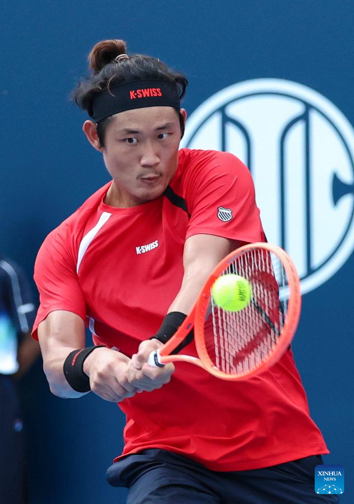 Zhang Zhizhen competes during the men's singles first round match between Zhang Zhizhen of China and Terence Atmane of France at 2025 China Open tennis tournament in Beijing, China, Sept. 25, 2025. (Photo by Ma Zihan/Xinhua)