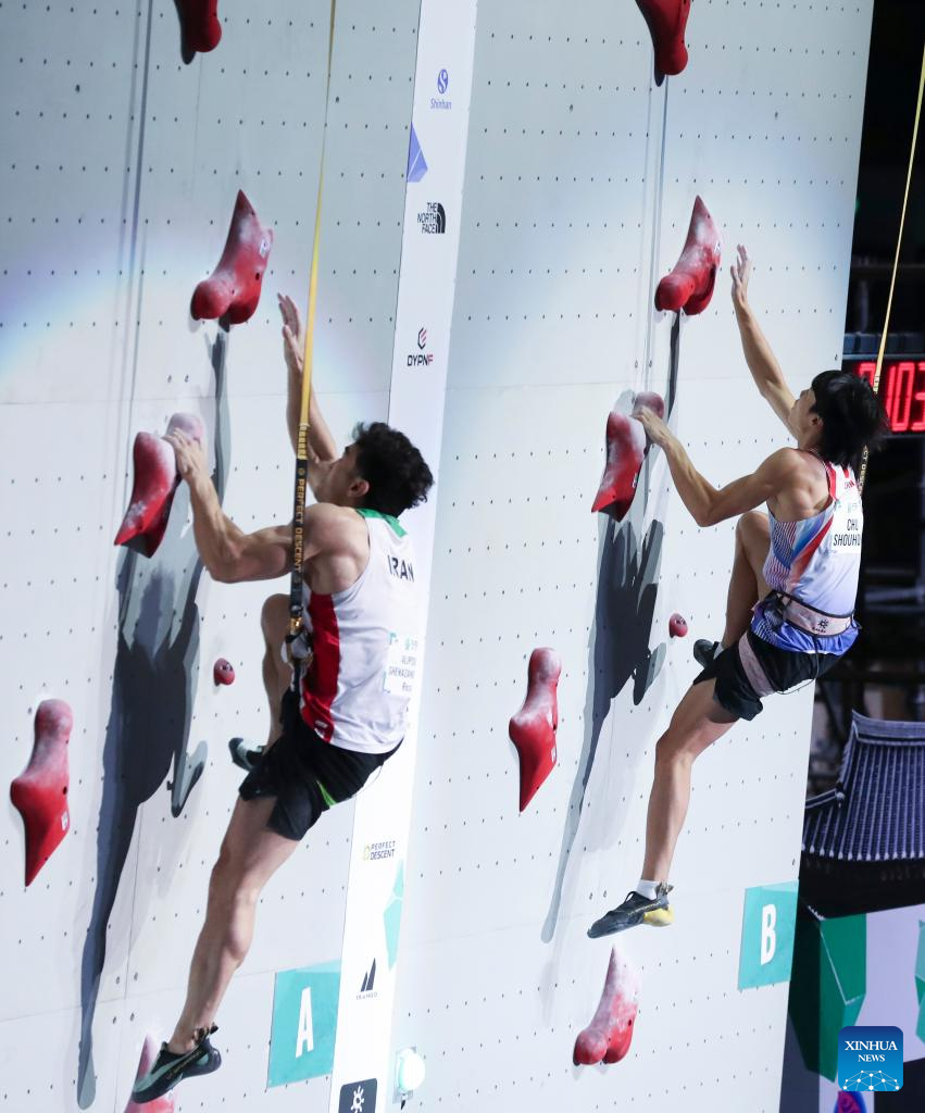 Chu Shouhong (R) of China competes against Reza Alipour Shenazandifard of Iran during the men's speed round of 16 race at the IFSC Climbing World Championships Seoul 2025 in Seoul, South Korea, Sept. 25, 2025. (Xinhua/Yao Qilin)