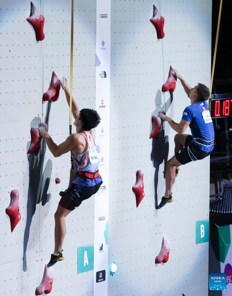 Wu Peng (L) of China competes against Guillaume Moro of France during the men's speed round of 16 race at the IFSC Climbing World Championships Seoul 2025 in Seoul, South Korea, Sept. 25, 2025. (Xinhua/Yao Qilin)