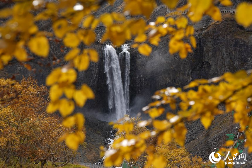 Photo taken on Sept. 22, 2025, shows the beautiful autumn scenery of the Changbai Waterfall scenic area in northeast China's Jilin Province. (People's Daily Online/Li Yang)