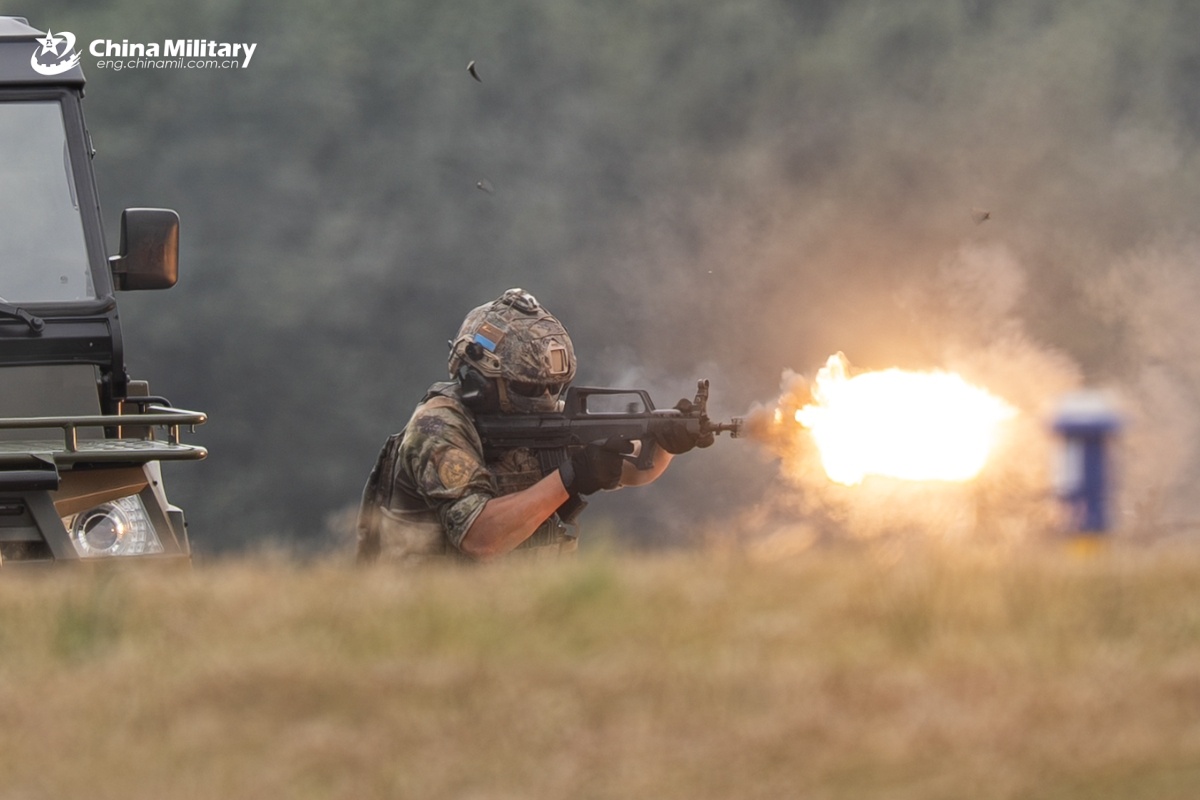 A special operations soldier assigned to the airborne troops under the Chinese PLA Air Force fires at the target in a counter-terrorism operating demonstration during the 2025 aviation open-day activities of the Chinese PLA Air Force and Changchun Air Show in Changchun City, northeast China's Jilin Province. (eng.chinamil.com.cn/Photo by Chen Gongyu)