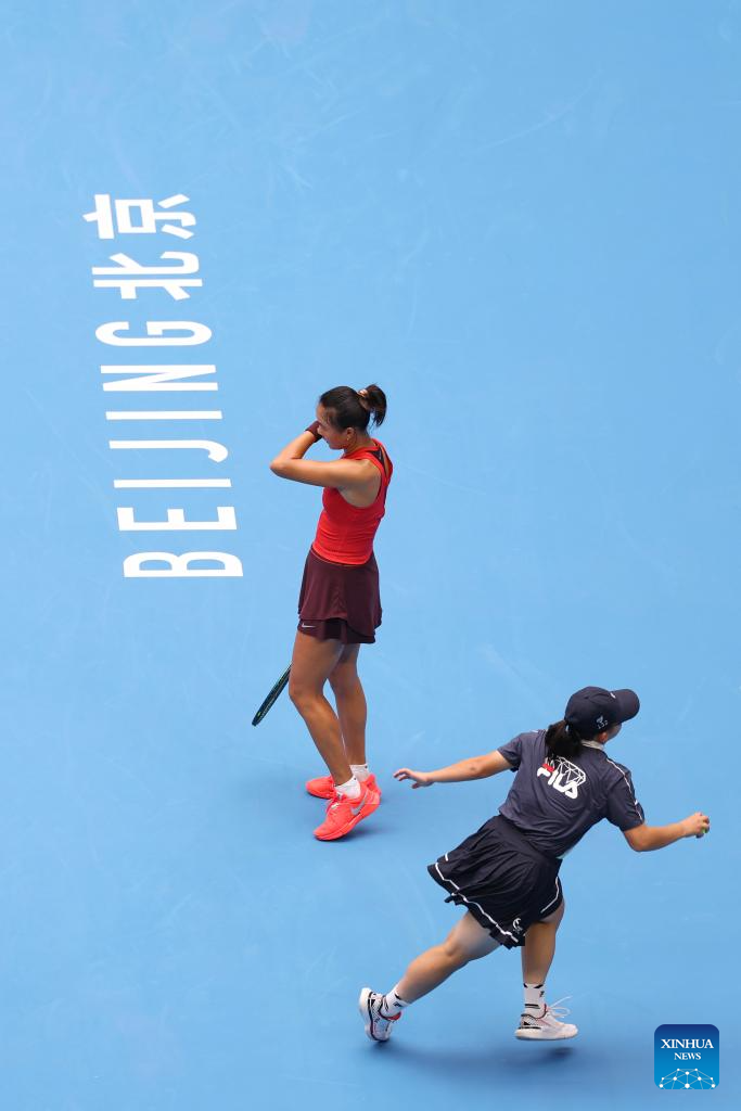 Yuan Yue (L) of China reacts during the women's singles second round match against Iga Swiatek of Poland at 2025 China Open tennis tournament in Beijing, China, Sept. 27, 2025. (Xinhua/Bai xuefei)