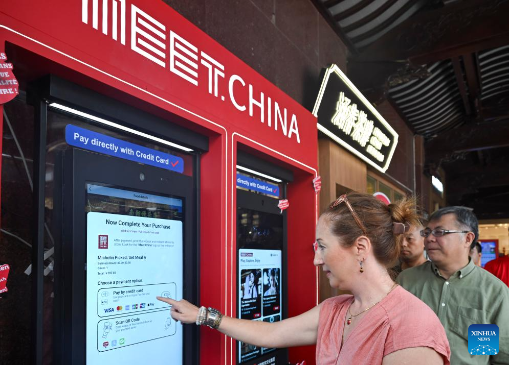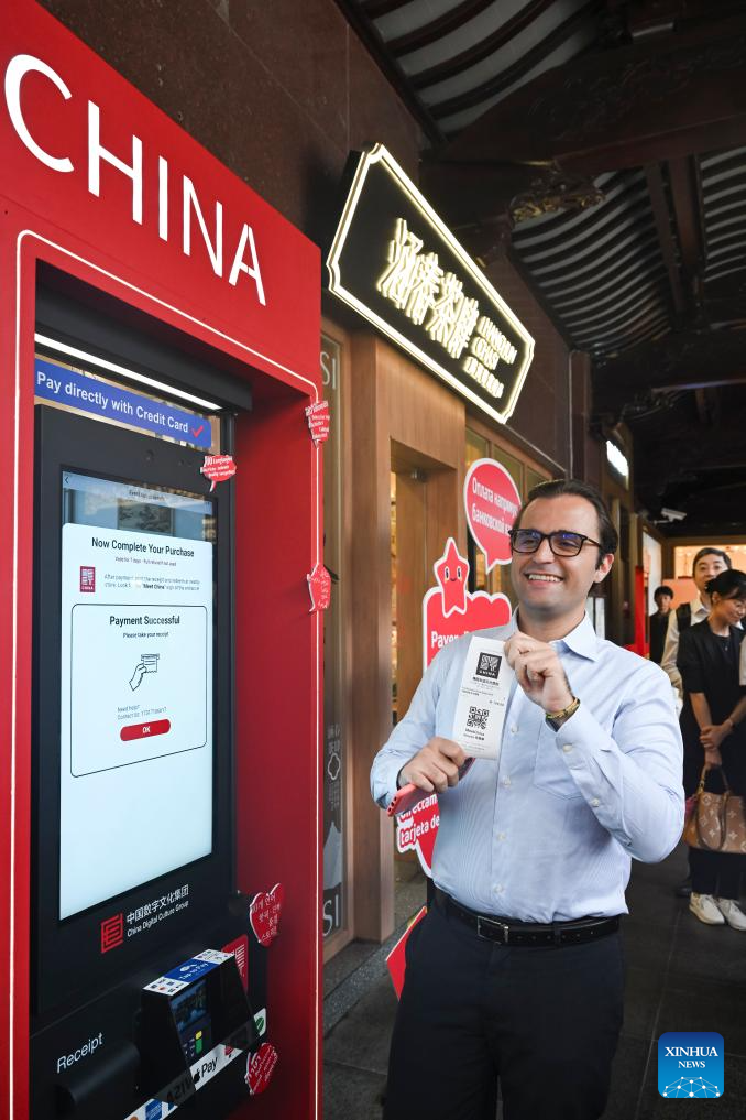 A foreign guest tries to use the "Meet China" Inbound Tourism Digital Consumption Screen in Yuyuan Garden, Shanghai, east China, Sept. 27, 2025. The first national site of the "Meet China" Inbound Tourism Digital Consumption Screen was launched here on Saturday.