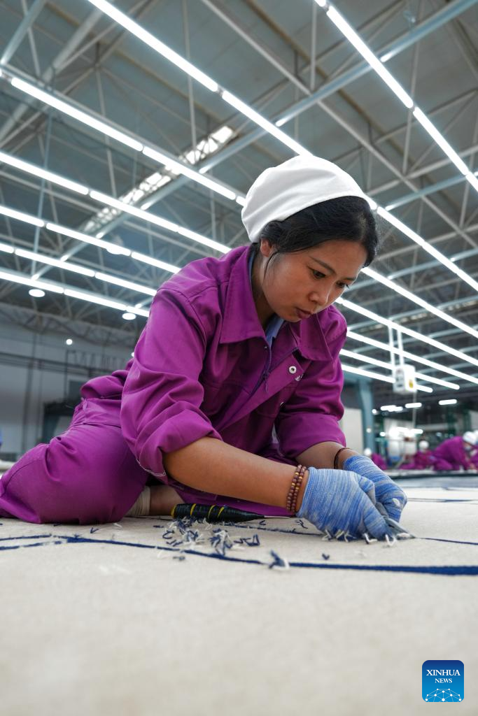 An employee works at a workshop making Tibetan carpets in Shengyuan carpet group in Xining, northwest China's Qinghai Province, Sept. 27, 2025. Tibetan carpet is a traditional handicraft on the Qinghai-Tibetan Plateau with a history of more than 1,000 years. The carpets are essential items for the nomadic people on the plateau to withstand the cold. The fine yak and sheep wool and the delicate weaving skills and patterns made the handmade products popular among overseas and domestic customers. Nowadays, Tibetan carpet has become an industry that injects new momentum into rural revitalization while preserving traditional skills. (Xinhua/Du Xiaowei)