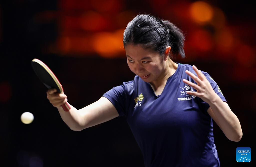 Liu Yangzi hits a return during the women's singles first round match between Wang Yidi of China and Liu Yangzi of Australia at the 2025 World Table Tennis (WTT) China Smash in Beijing, China, Sept. 28, 2025. (Xinhua/Wang Kaiyan)