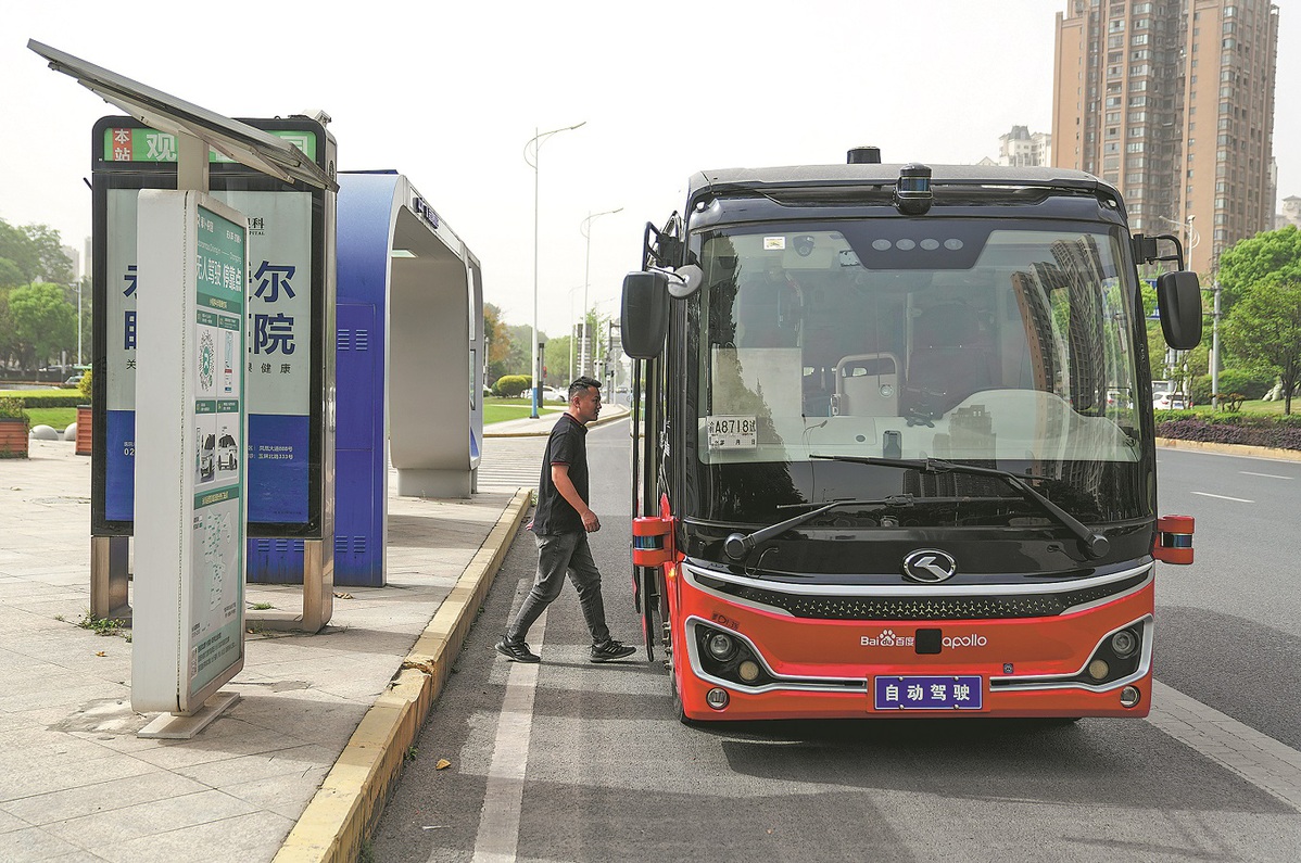 A passenger gets on an autonomous driving bus in Chongqing's Yongchuan district in April. (CHEN ANXIN/XINHUA)