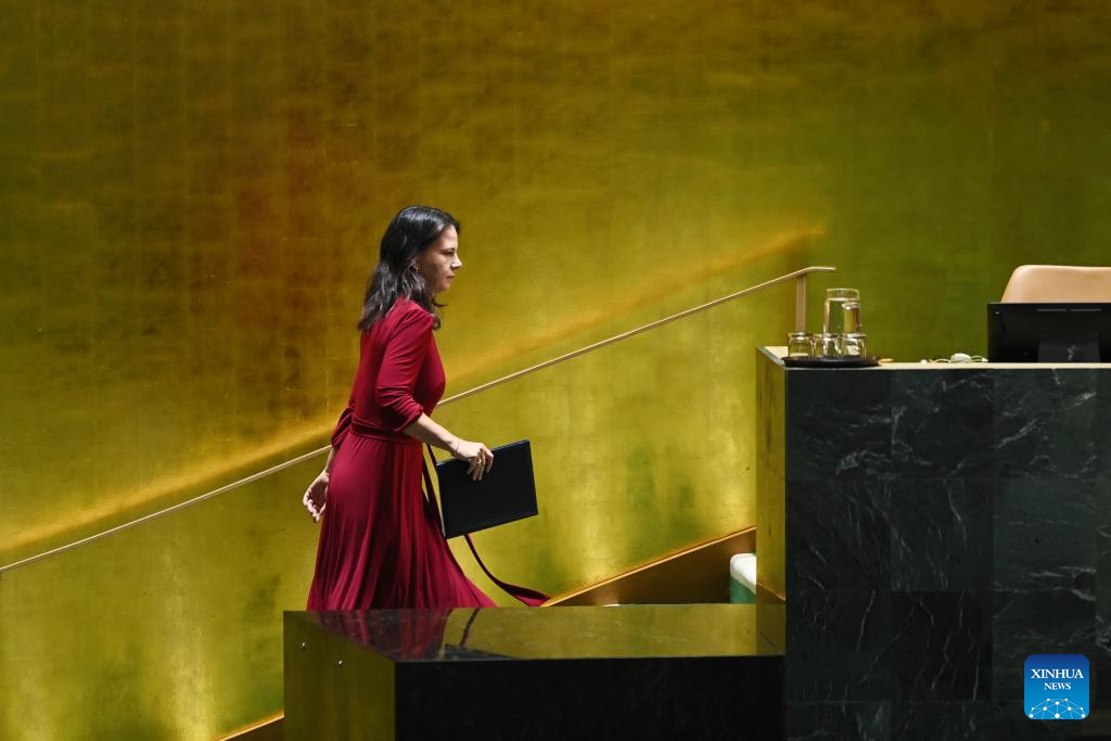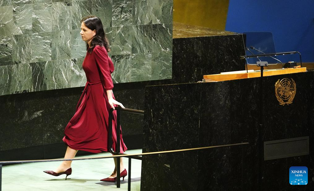 Annalena Baerbock, president of the 80th session of the United Nations General Assembly, leaves after delivering closing remarks during the General Debate of the 80th session of the United Nations General Assembly (UNGA) at the UN headquarters in New York, on Sept. 29, 2025. The General Debate of the 80th session of the UN General Assembly concluded on Monday. (Xinhua/Wu Xiaoling)