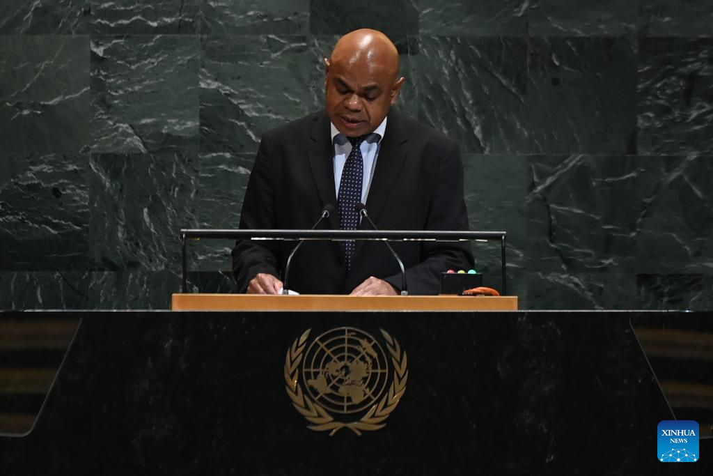 Vanuatuan Permanent Representative to the United Nations Odo Tevi delivers a speech during the General Debate of the 80th session of the United Nations General Assembly (UNGA) at the UN headquarters in New York, on Sept. 29, 2025. (Xinhua/Li Rui)