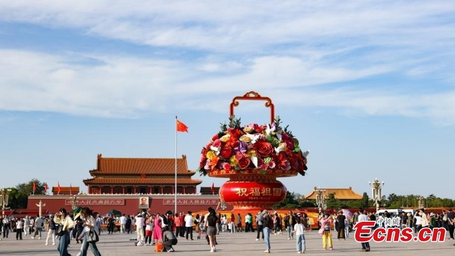 Visitors pose for pictures in front of a flower basket at Tiananmen Square in Beijing on Sept. 28, 2025. (Photo: China News Service/Yang Yuran)