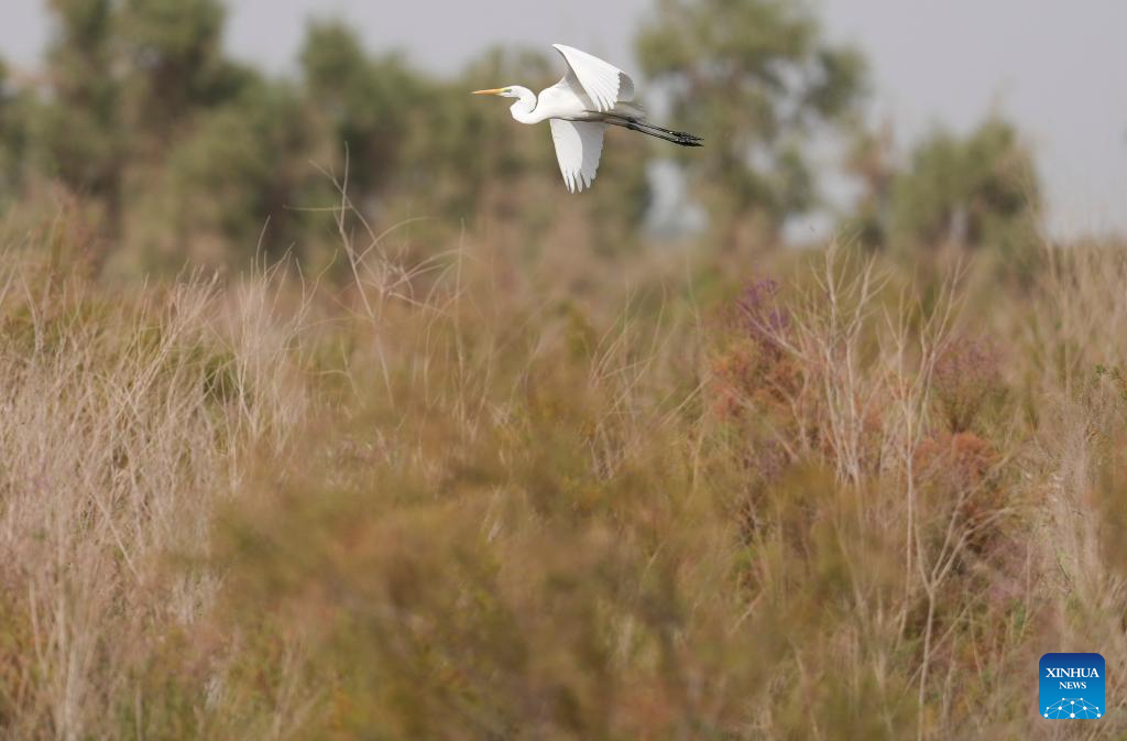 A white egret is pictured flying above a wetland of the Tarim River near Karquga Township in Yuli County, Mongolian Autonomous Prefecture of Bayingolin, northwest China's Xinjiang Uygur Autonomous Region, Sept. 20, 2025. (Xinhua/Jiang Wenyao)