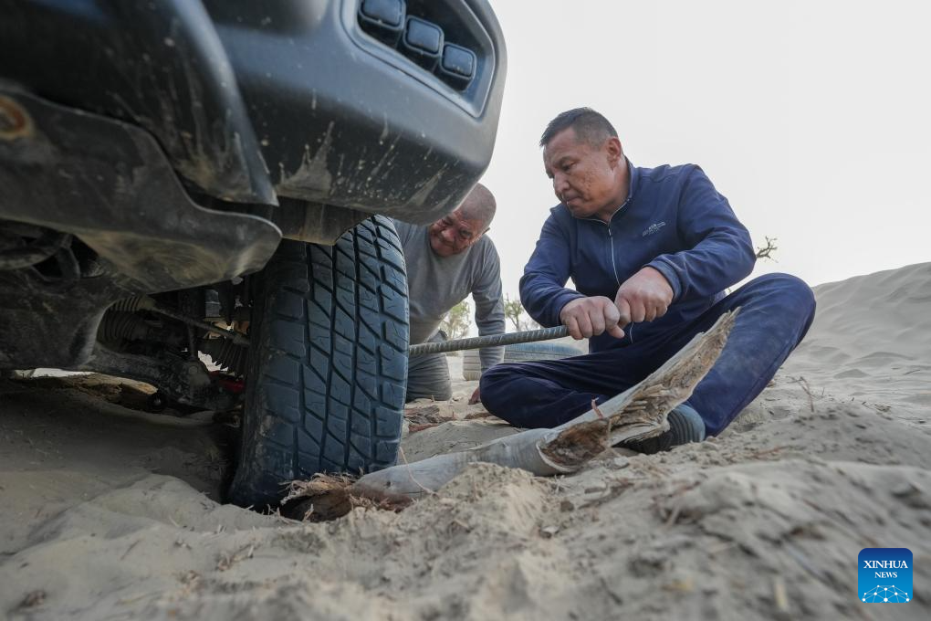 Forest ranger Eli Niyaz (R) and his colleague repair their vehicle in Taklimakan Desert in Yuli County, Mongolian Autonomous Prefecture of Bayingolin, northwest China's Xinjiang Uygur Autonomous Region, Sept. 19, 2025. (Xinhua/Jiang Wenyao)
