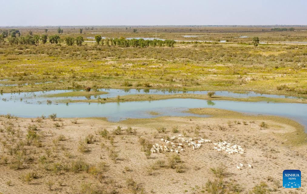 This photo taken on Sept. 20, 2025 shows sheep foraging at a wetland of the Tarim River in Yuli County, Mongolian Autonomous Prefecture of Bayingolin, northwest China's Xinjiang Uygur Autonomous Region. (Xinhua/Jiang Wenyao)