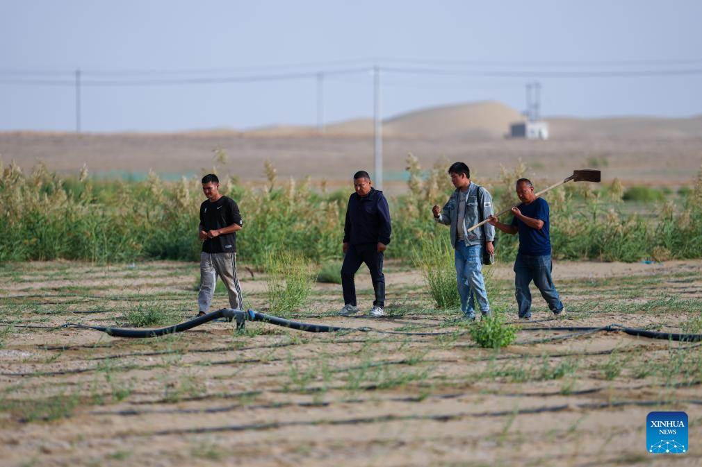 Staff members check the growth of apocynum venetum in Yuli County, northwest China's Xinjiang Uygur Autonomous Region, Sept. 20, 2025. (Xinhua/Jiang Wenyao)