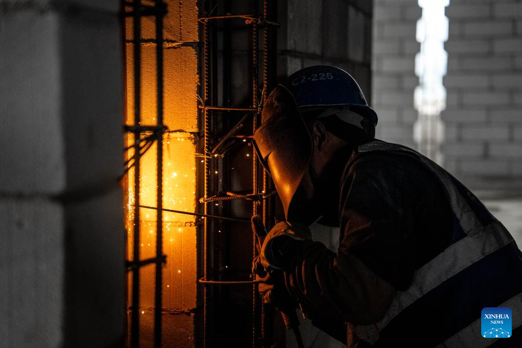 A welder works at the construction site of a hospital in Kunming, southwest China's Yunnan Province, Oct. 2, 2025. Workers from all walks of life have been standing fast at their posts and fulfilling their duties with full dedication during the eight-day National Day and Mid-Autumn Festival holiday. (Xinhua/Hu Chao)