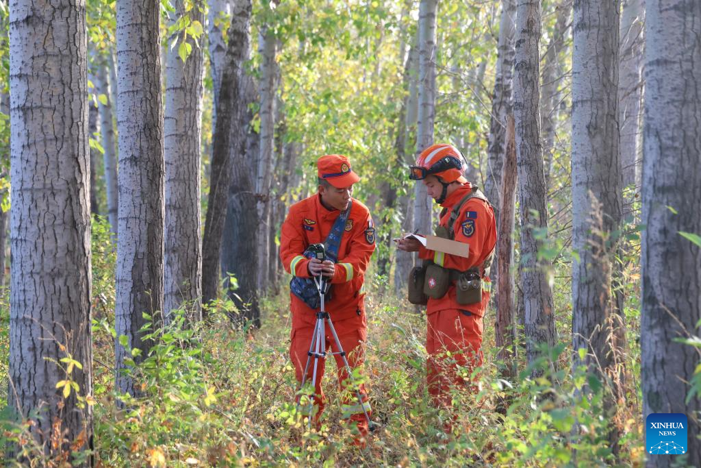 Firefighters measure wind, humidity and flammable content in a forest in Harbin, northeast China's Heilongjiang Province, Oct. 2, 2025. Workers from all walks of life have been standing fast at their posts and fulfilling their duties with full dedication during the eight-day National Day and Mid-Autumn Festival holiday. (Photo by Yang Tieyan/Xinhua)