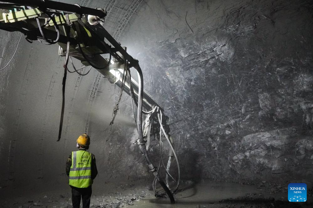 A worker carries out tasks at the construction site of a tunnel of the Xi'an-Chongqing high-speed railway in Dazhou, southwest China's Sichuan Province, Oct. 2, 2025. Workers from all walks of life have been standing fast at their posts and fulfilling their duties with full dedication during the eight-day National Day and Mid-Autumn Festival holiday. (Xinhua/Wang Xi)