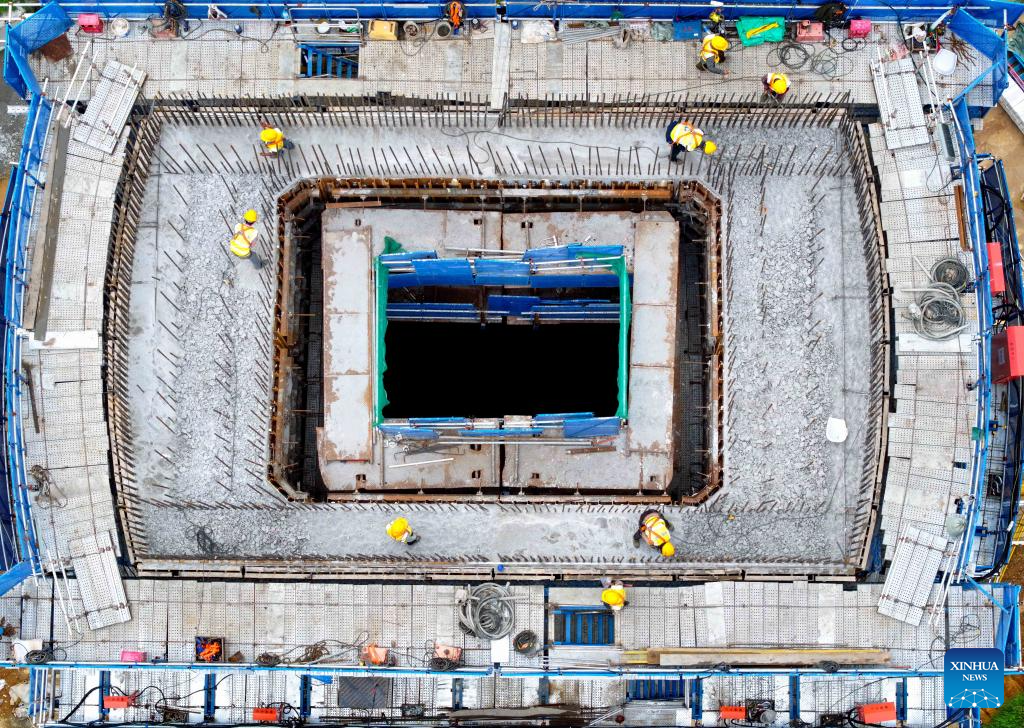 Workers carry out tasks at a construction site in Xuhui District, east China's Shanghai, Oct. 2, 2025. Workers from all walks of life have been standing fast at their posts and fulfilling their duties with full dedication during the eight-day National Day and Mid-Autumn Festival holiday. (Xinhua/Ding Ting)