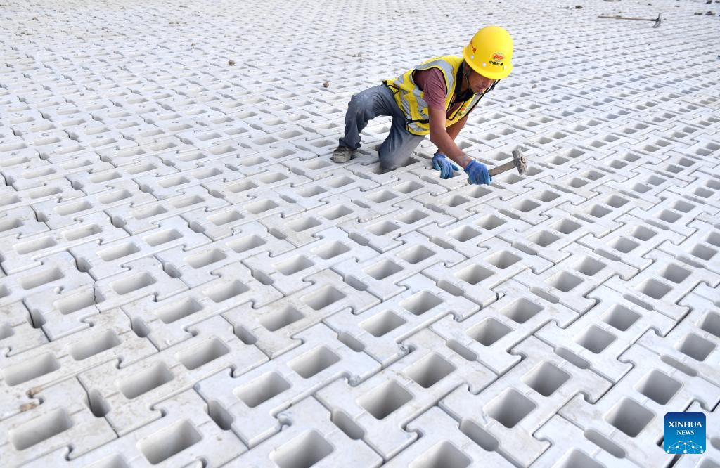A worker carries out tasks at the construction site of a flood control project in Langfang City, north China's Hebei Province, Oct. 2, 2025. Workers from all walks of life have been standing fast at their posts and fulfilling their duties with full dedication during the eight-day National Day and Mid-Autumn Festival holiday. (Xinhua/Wang Xiao)