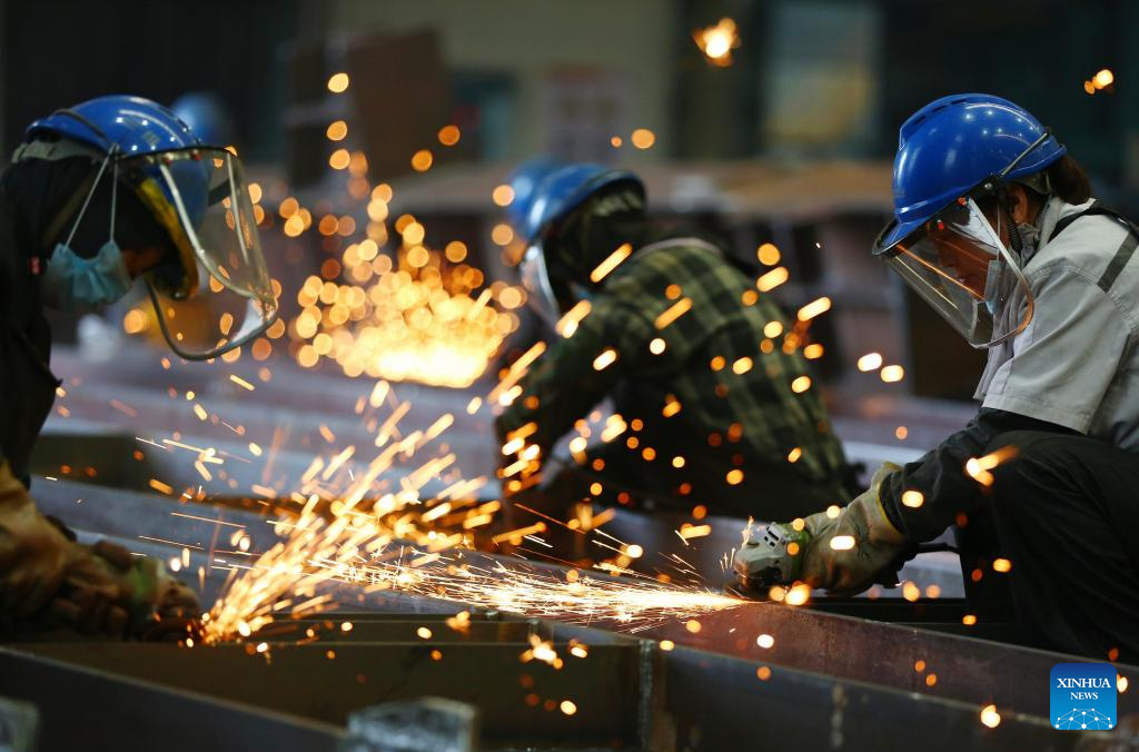 Workers grind steel components at a workshop in Tengzhou City, east China's Shandong Province, Oct. 2, 2025. Workers from all walks of life have been standing fast at their posts and fulfilling their duties with full dedication during the eight-day National Day and Mid-Autumn Festival holiday. (Photo by Li Zhijun/Xinhua)