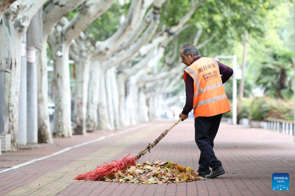A sanitation worker cleans fallen leaves in Wenxian County, Jiaozuo City, central China's Henan Province, Oct. 2, 2025. Workers from all walks of life have been standing fast at their posts and fulfilling their duties with full dedication during the eight-day National Day and Mid-Autumn Festival holiday. (Photo by Xu Hongxing/Xinhua)