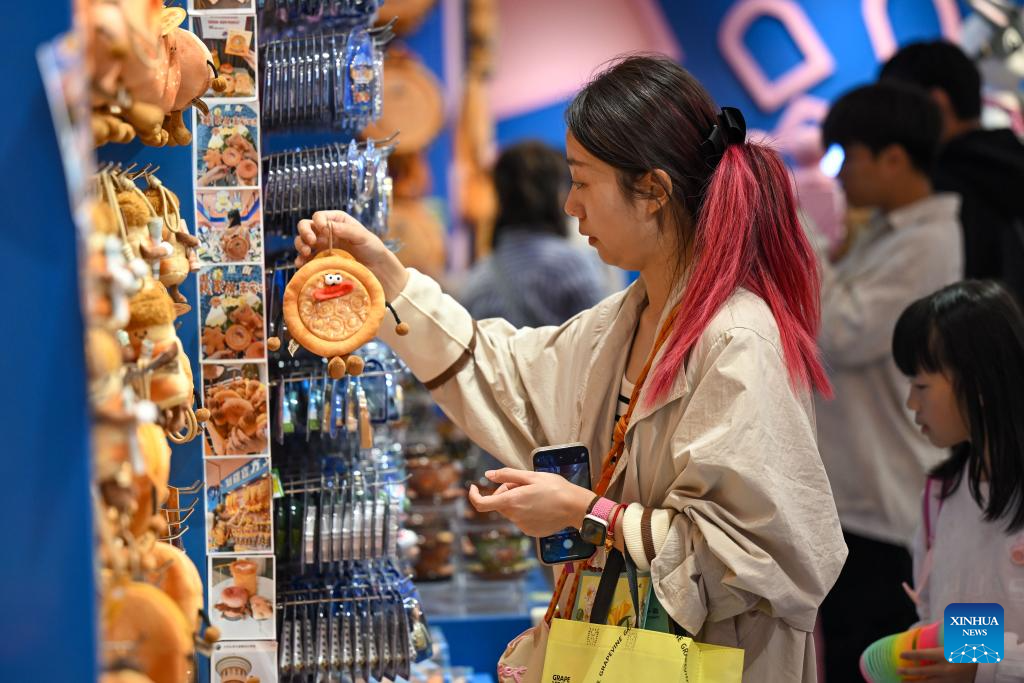 Tourists select commodities at the Xinjiang International Grand Bazaar in Urumqi, northwest China's Xinjiang Uygur Autonomous Region, Oct. 1, 2025. (Xinhua/Ding Lei)
