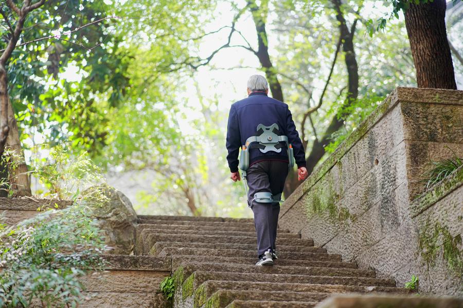 A senior citizen wearing an exoskeleton walking aid device climbs the stairs in Hangzhou, east China's Zhejiang Province, Feb. 24, 2025. (RoboCT/Handout via Xinhua)