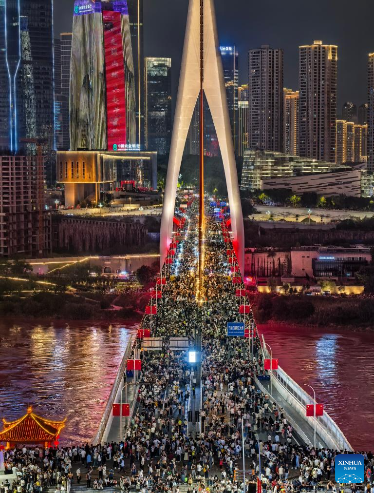 Tourists visit the Qiansimen Bridge in southwest China's Chongqing Municipality, Oct. 3, 2025. (Photo by Guo Xu/Xinhua)