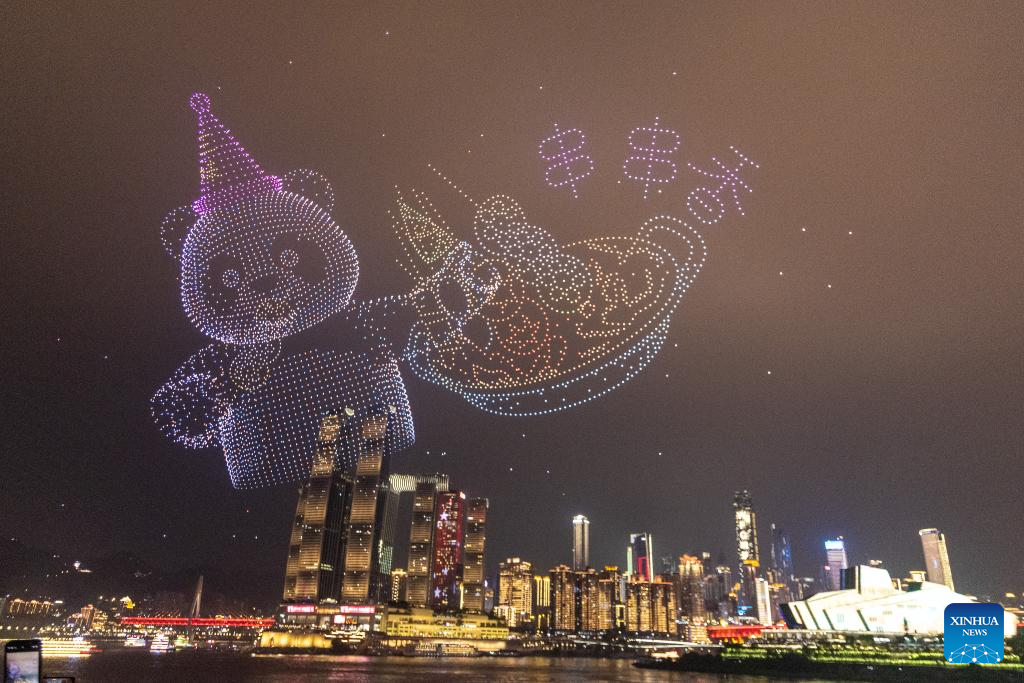 This photo taken on Oct. 2, 2025 shows a drone light show in southwest China's Chongqing Municipality. (Xinhua/Huang Wei)