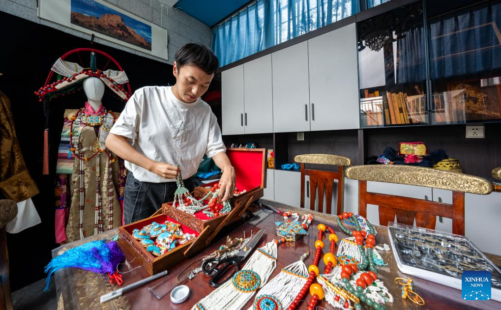 Padruk Tendar arranges Tibetan-style accessories at home in Lhasa, southwest China's Xizang Autonomous Region, Sept. 11, 2025. (Xinhua/Tenzin Nyida)