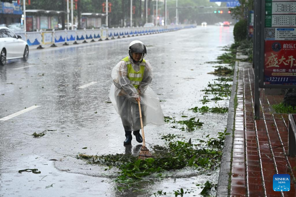 A sanitation worker cleans up the street in Beihai, south China's Guangxi Zhuang Autonomous Region, Oct. 6, 2025. Typhoon Matmo, the 21st named storm of the 2025 Pacific typhoon season, made landfall along the coast of Guangxi on Monday, bringing strong winds and heavy rainfall. (Photo by Li Junguang/Xinhua)