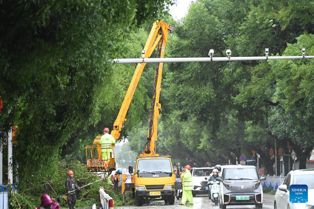 Workers clear up fallen tress in Beihai, south China's Guangxi Zhuang Autonomous Region, Oct. 6, 2025. Typhoon Matmo, the 21st named storm of the 2025 Pacific typhoon season, made landfall along the coast of Guangxi on Monday, bringing strong winds and heavy rainfall. (Photo by Li Junguang/Xinhua)