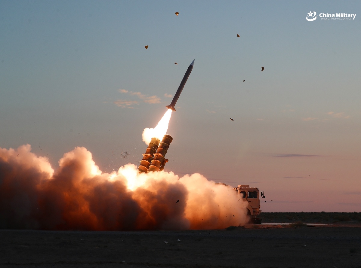An HQ-22 air defense missile system attached to a unit under the Chinese PLA Air Force fires an anti-aircraft missile during a live-fire shooting training exercise in late September, 2025. (eng.chinamil.com.cn/Photo by Yuan Hai)