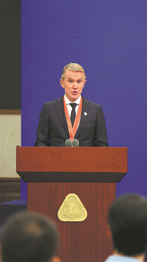 Bertrand Regnier from France, global managing partner of EY French Business Network, speaks on behalf of the award recipients at the presentation ceremony of the 2025 Magnolia Gold Award in Shanghai. [Photo by Gao Erqiang/China Daily]