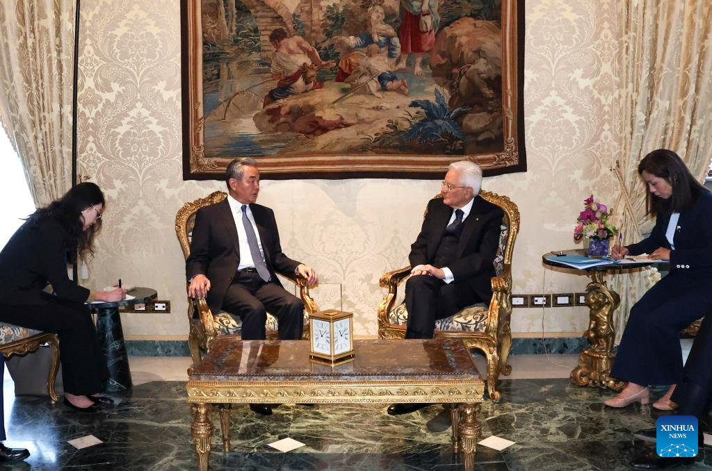 Italian President Sergio Mattarella meets with Chinese Foreign Minister Wang Yi, also a member of the Political Bureau of the Communist Party of China Central Committee, in Rome, Italy, Oct. 9, 2025. (Xinhua/Li Jing)