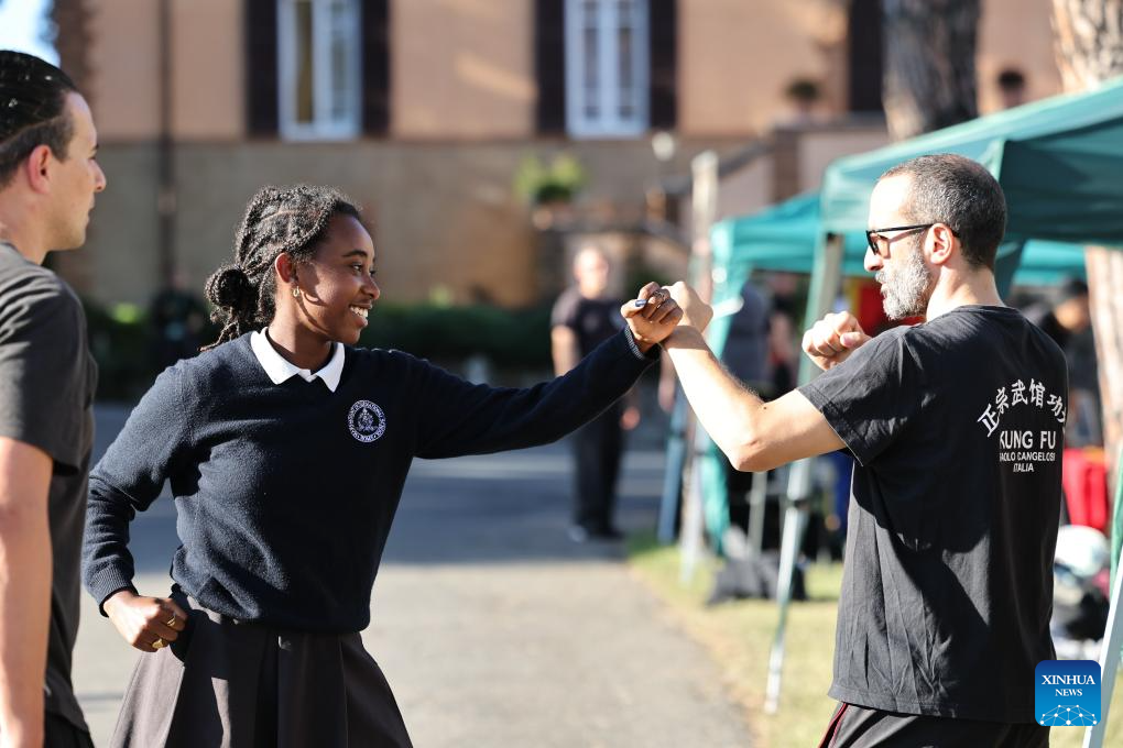 Local Chinese culture enthusiasts perform Chinese Kung Fu during a Mid-Autumn-themed funfair at Marymount International School in Rome, Italy, on Oct. 10, 2025. The funfair was held here on Friday, where students and local residents enjoyed a variety of Chinese cultural activities and performances presented by local enthusiasts of Chinese culture. (Xinhua/Li Jing)