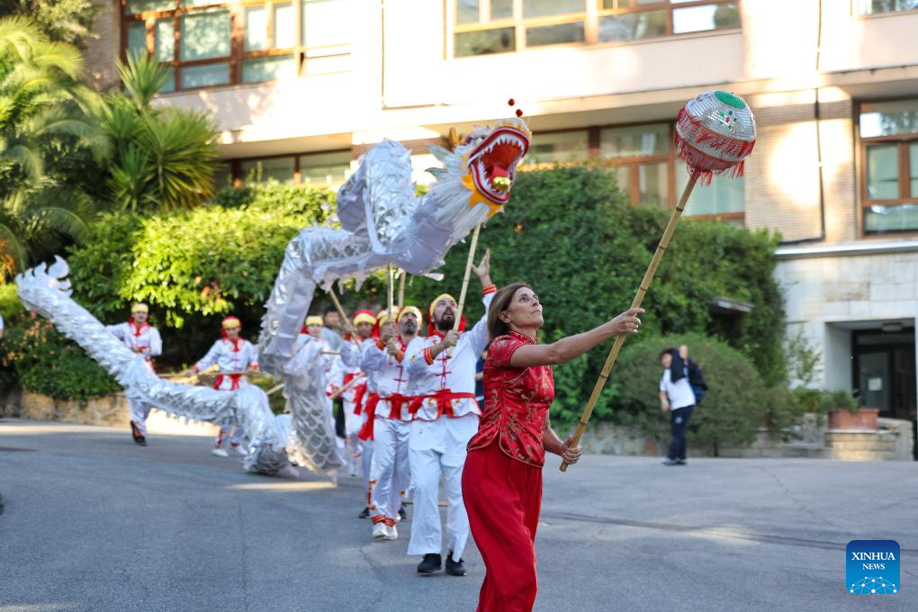 Local Chinese culture enthusiasts perform dragon dance during a Mid-Autumn-themed funfair at Marymount International School in Rome, Italy, on Oct. 10, 2025. The funfair was held here on Friday, where students and local residents enjoyed a variety of Chinese cultural activities and performances presented by local enthusiasts of Chinese culture. (Xinhua/Li Jing)