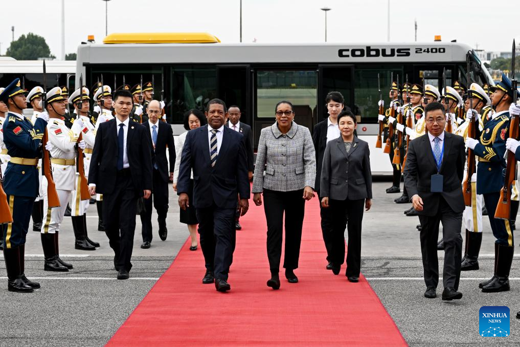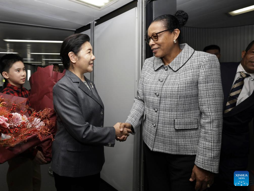President of the Commonwealth of Dominica Sylvanie Burton arrives in Beijing, capital of China, on Oct. 11, 2025, for the upcoming Global Leaders' Meeting on Women. (Xinhua/Zhang Yuwei)