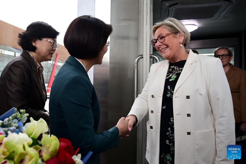 Icelandic President Halla Tomasdottir arrives in Beijing, capital of China, on Oct. 12, 2025, for the upcoming Global Leaders' Meeting on Women. (Xinhua/Zou Jingyi)