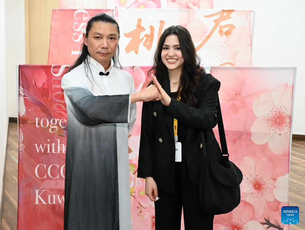 A woman poses for photos with a Tai Chi performer at the China Cultural Center in Kuwait, Hawalli Governorate, Kuwait, Oct. 12, 2025. The official inauguration ceremony for the Chinese Cultural Center in Kuwait was held here on Sunday, marking the full operation of the Gulf region's first Chinese cultural center. (Photo by Asad/Xinhua)